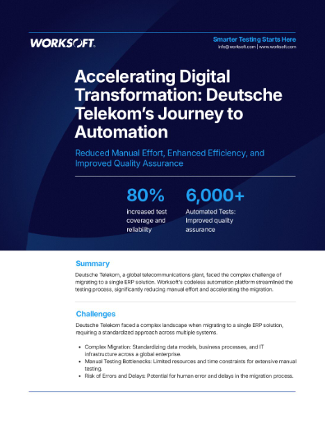 Deutsche Telekom, a global telecommunications leader, streamlined a complex, multi-country ERP migration using Worksoft’s automation platform. Empowering business users to create and execute tests, they achieved over 80% automation coverage, reducing manual effort and accelerating the project.